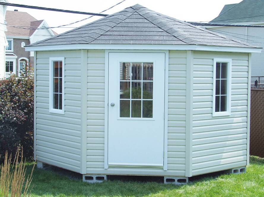 DimensionsDisponible en 7’x7’, 8’x8 ’, 9’x9’, 10’x10’, 11’x11’et 12’x12’PortePorte standard ou porte vitrée 23” x 37” (en option)Fenêtres2 fenêtres PVC blanc 16” x 36”DesignForme 5 côtés offrant un style unique et élégantAvec optionsPlusieurs configurations disponibles