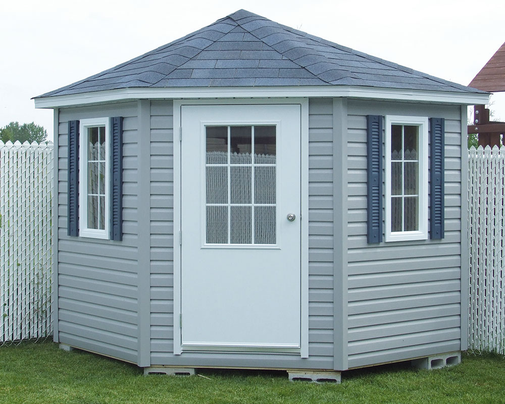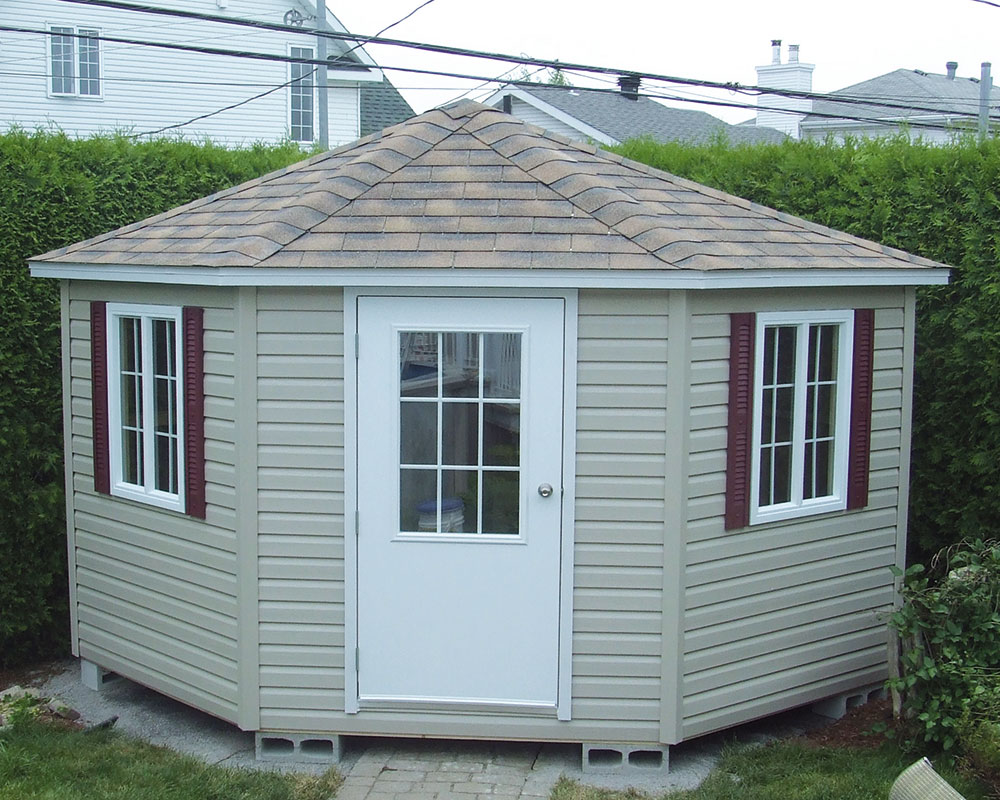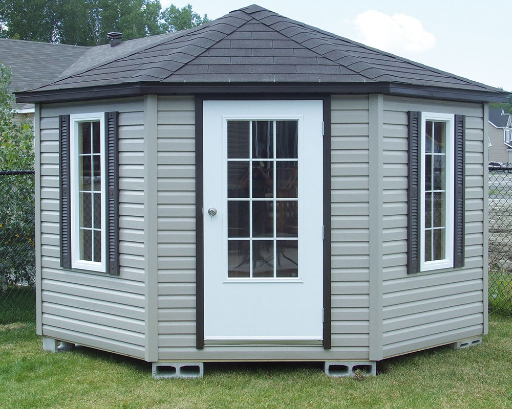 DimensionsDisponible en 7’x7’, 8’x8 ’, 9’x9’, 10’x10’, 11’x11’et 12’x12’PortePorte standard ou porte vitrée 23” x 37” (en option)Fenêtres2 fenêtres PVC blanc 16” x 36”DesignForme 5 côtés offrant un style unique et élégantAvec optionsPlusieurs configurations disponiblesShare